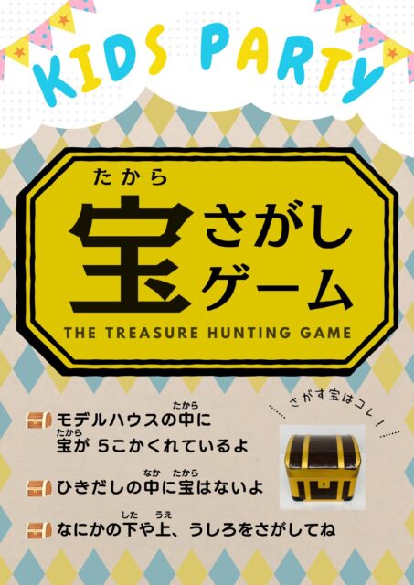 モデルハウス内のあちこちに 5つの宝箱 を隠してあります!宝箱を見つけると中にスタンプが入っていて、貰った スタンプカードにスタンプを押していただきます!