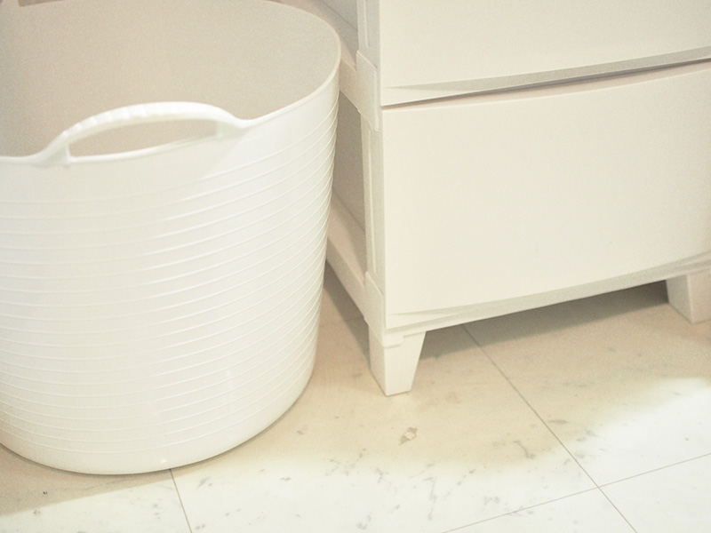 また、タオルや小物を入れている収納が、籐のかごなどナチュラルテイストのものの場合は、シンプルな白の収納ケースに置き換えてみましょう。