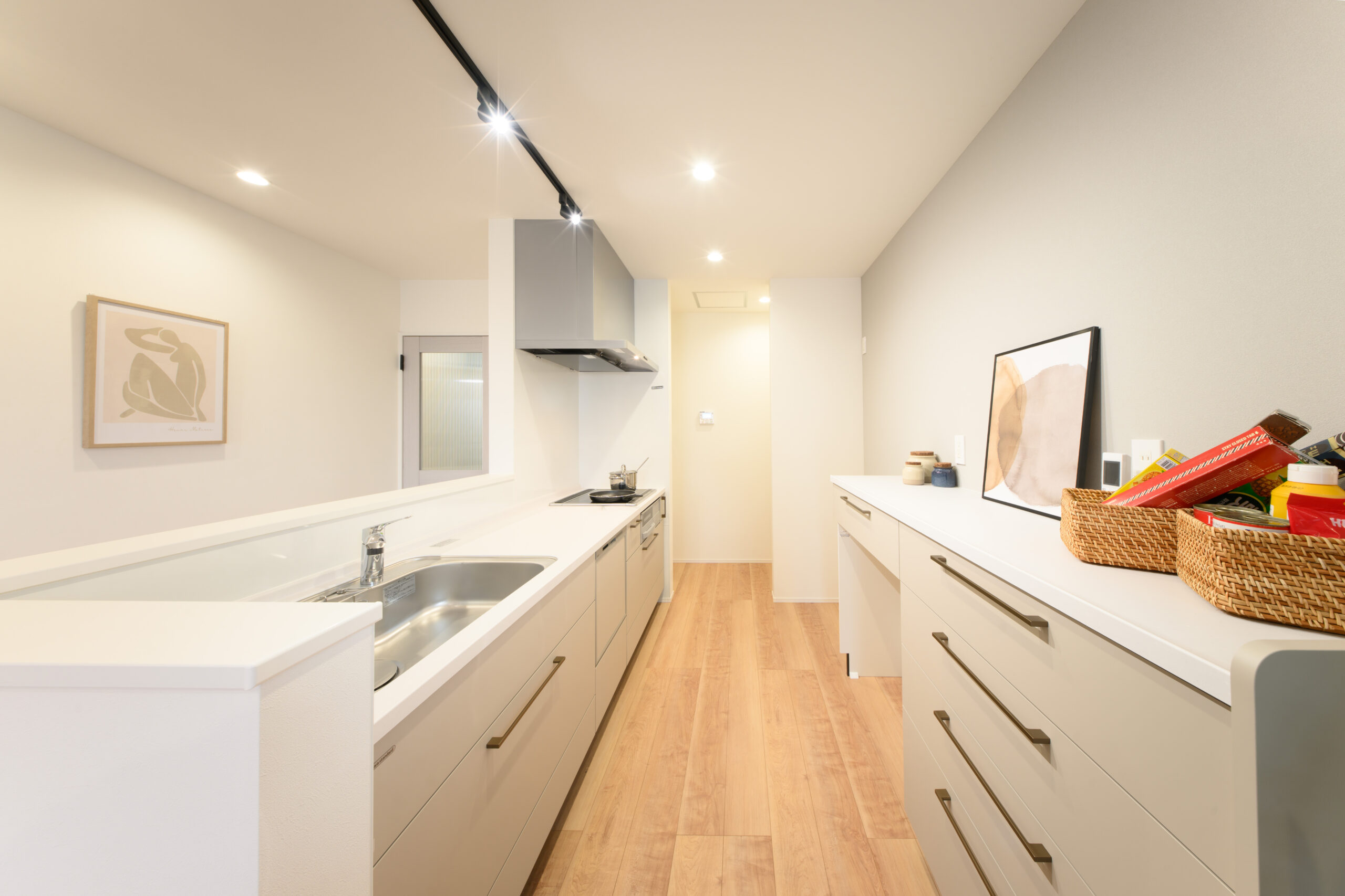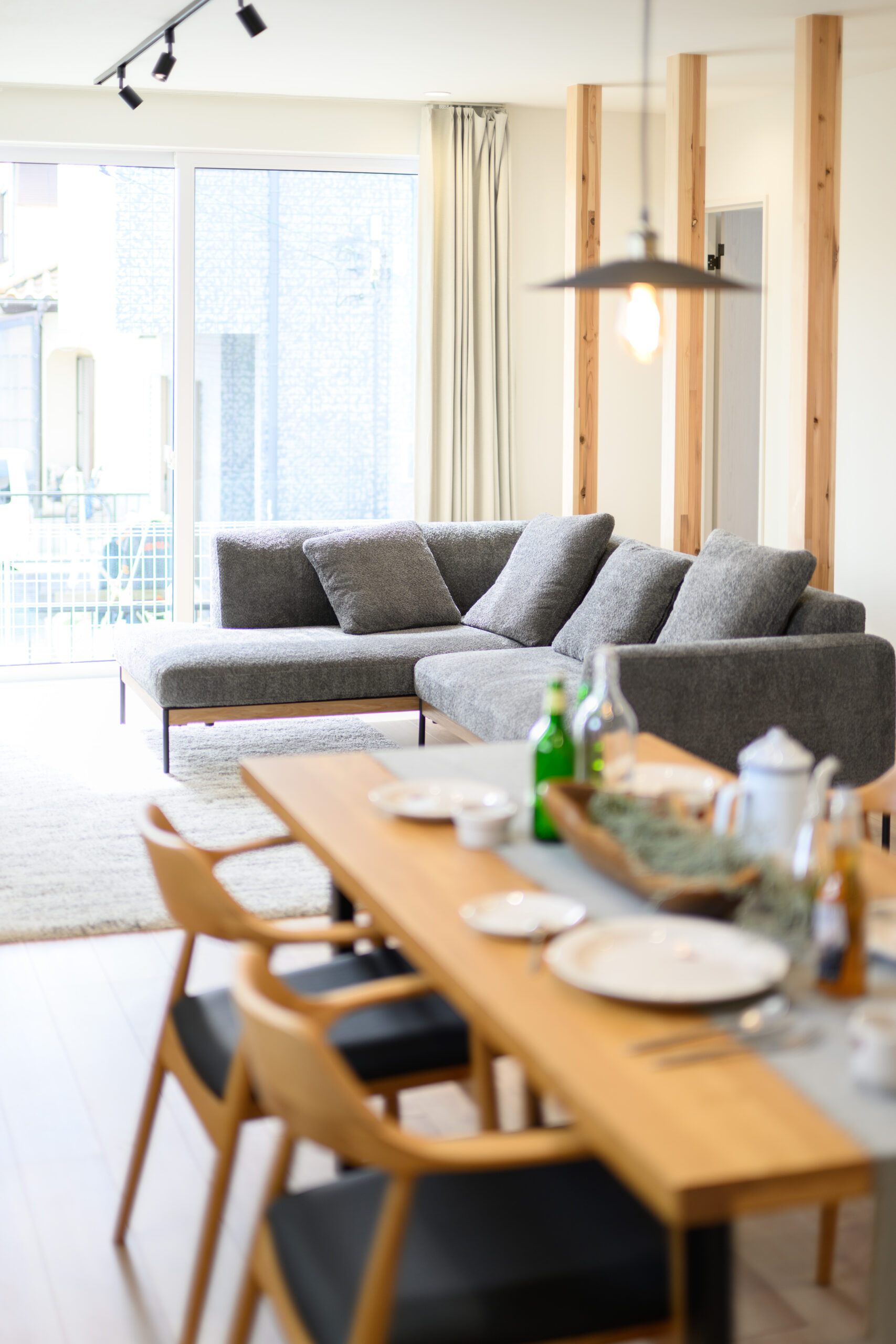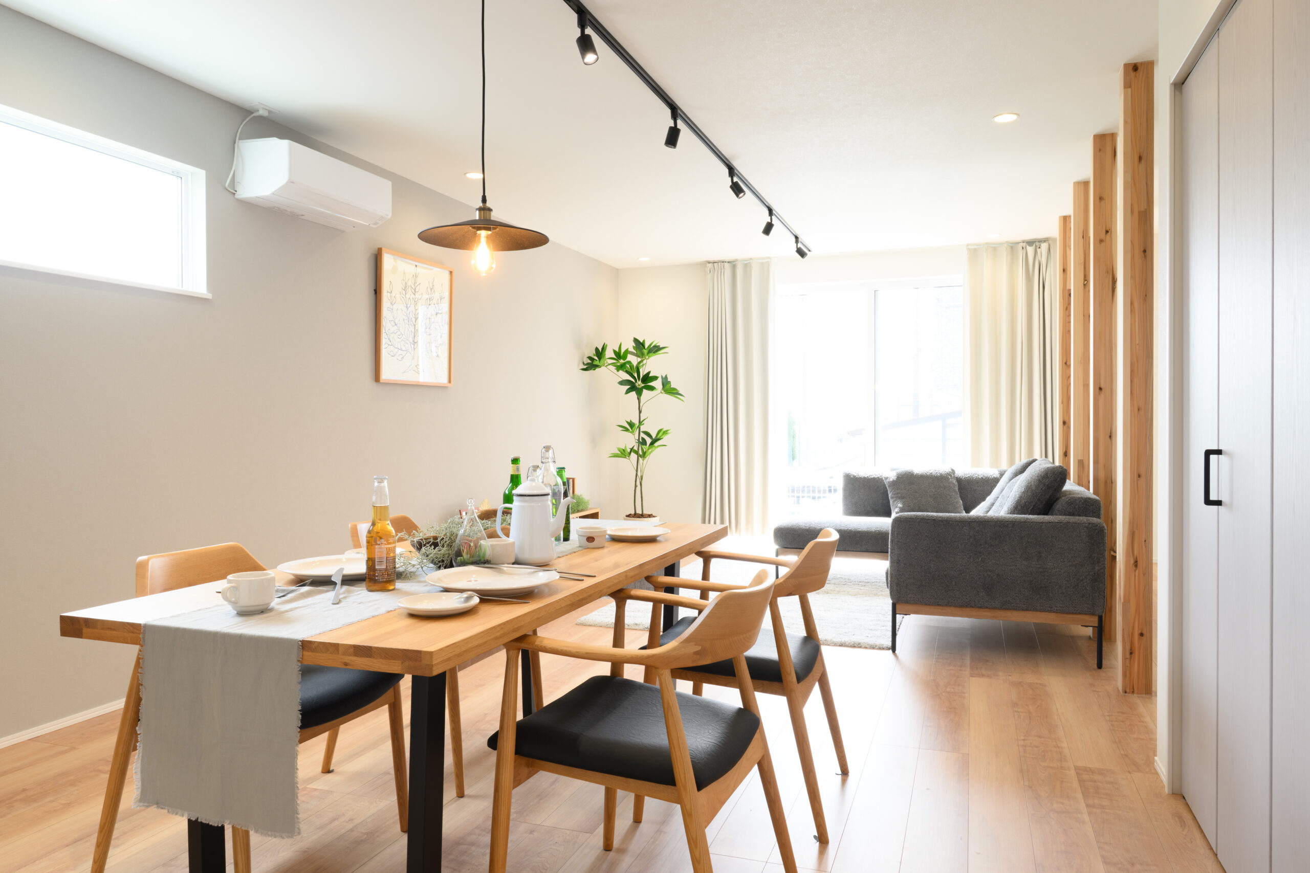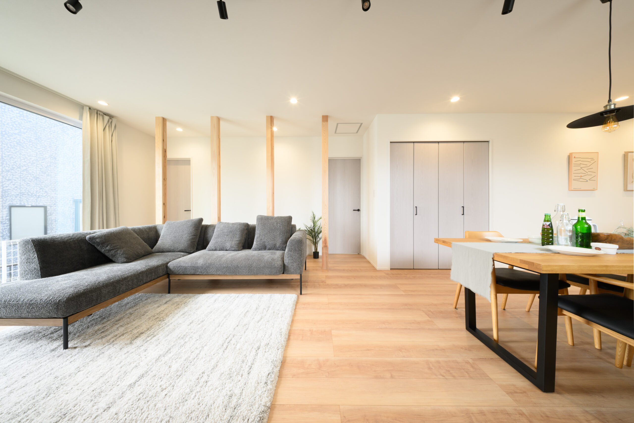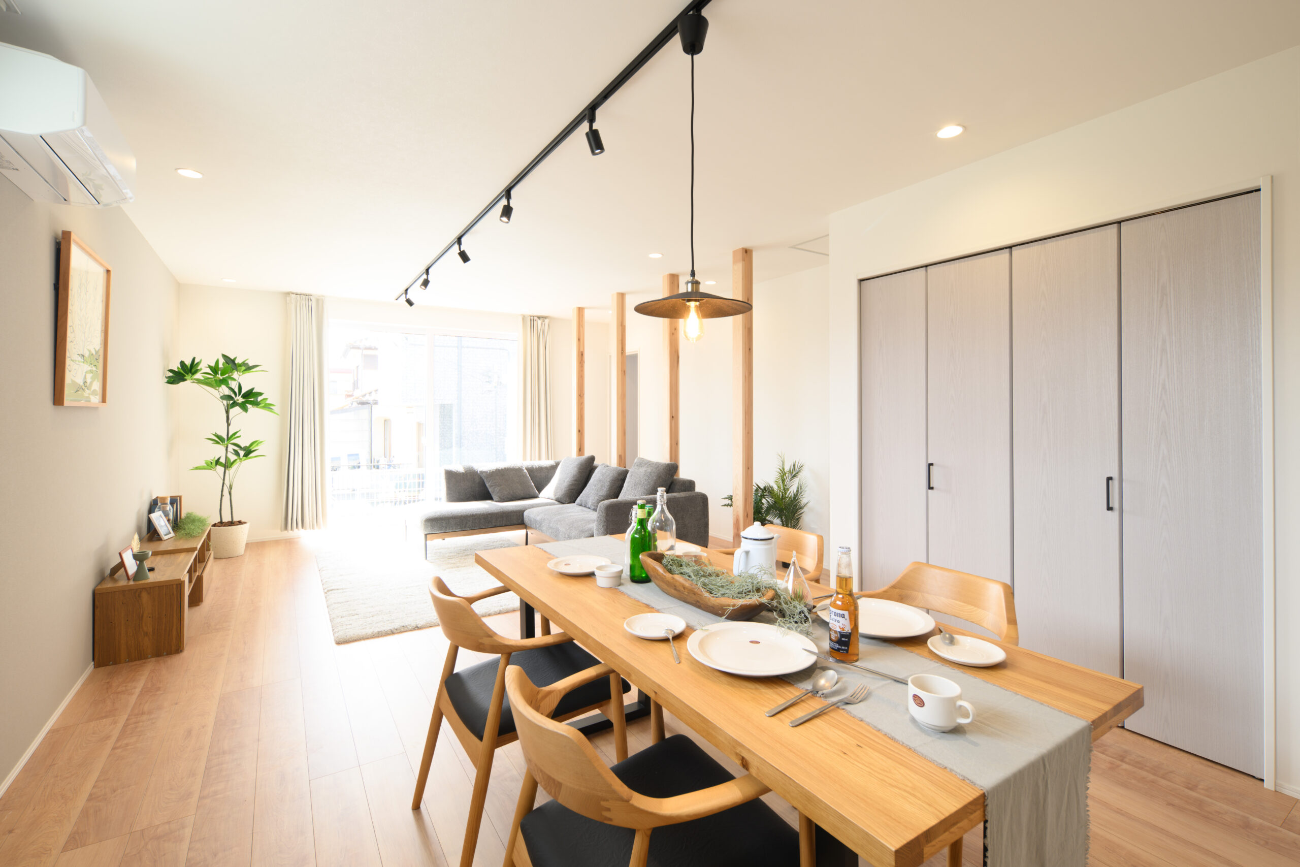 明るい陽光が差し込むリビングは、キッチンまで一直線につながる心地よい動線設計。料理をしながら家族との会話が自然に生まれます。