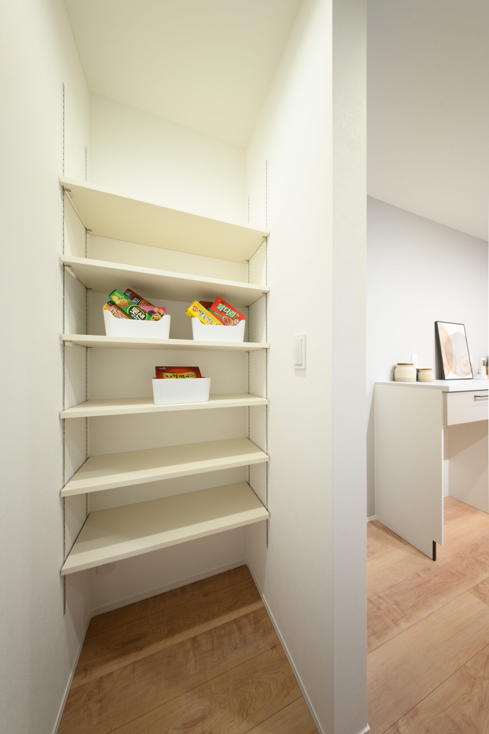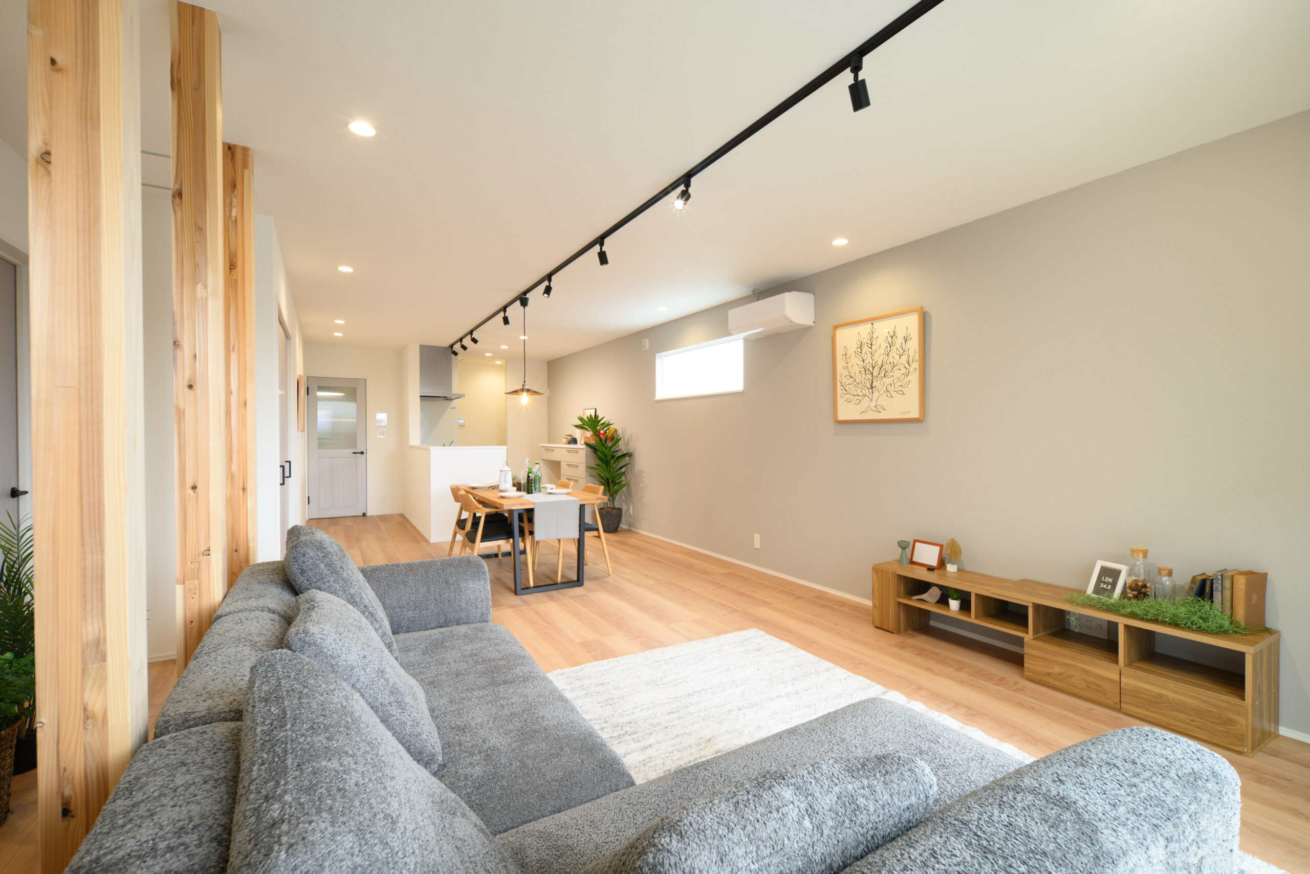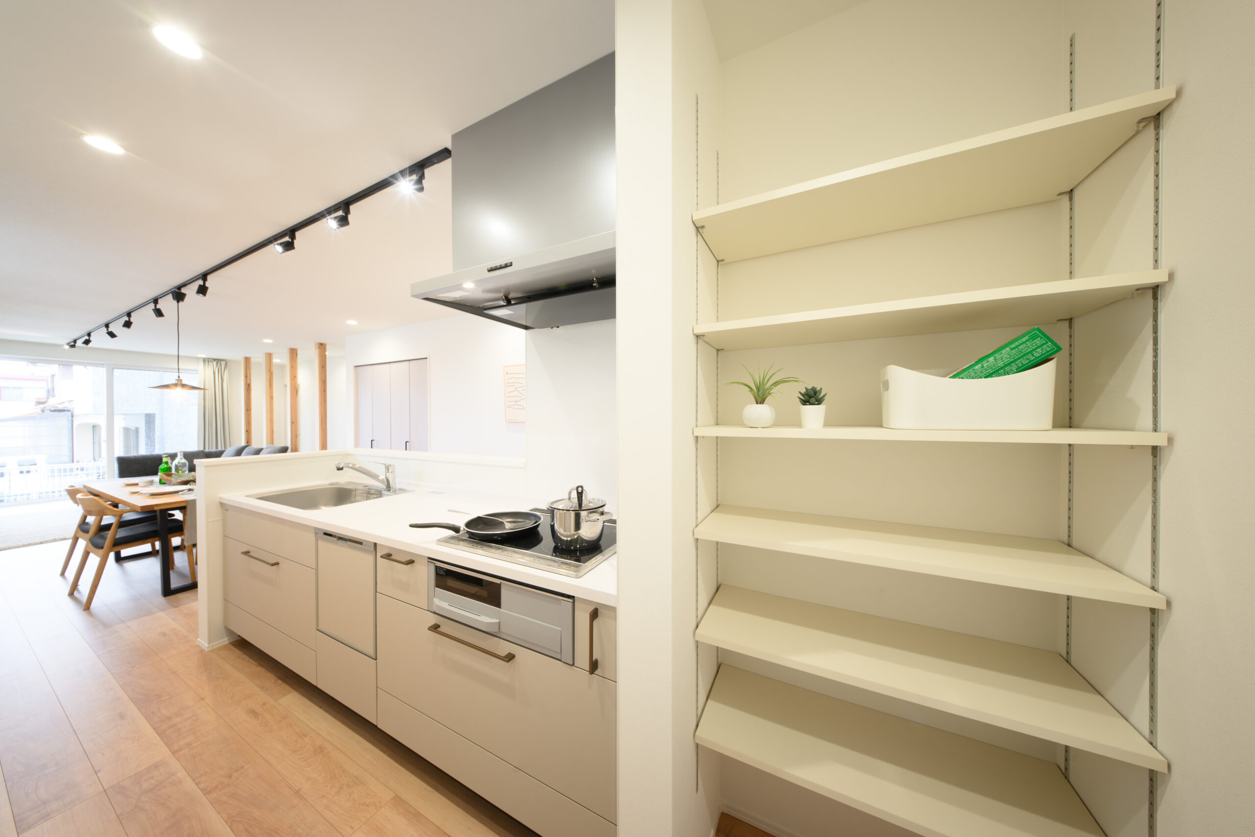 化粧柱がアクセントとなり、パントリーや中央収納も充実していて、日々の暮らしがこの一空間で完結できます。