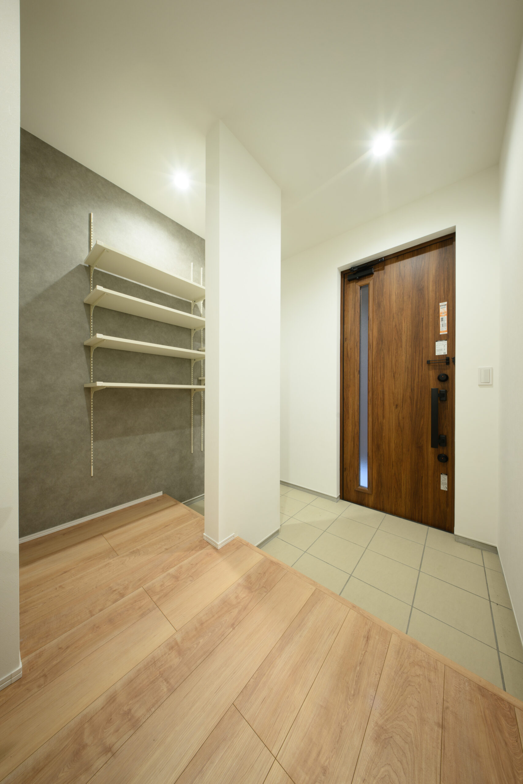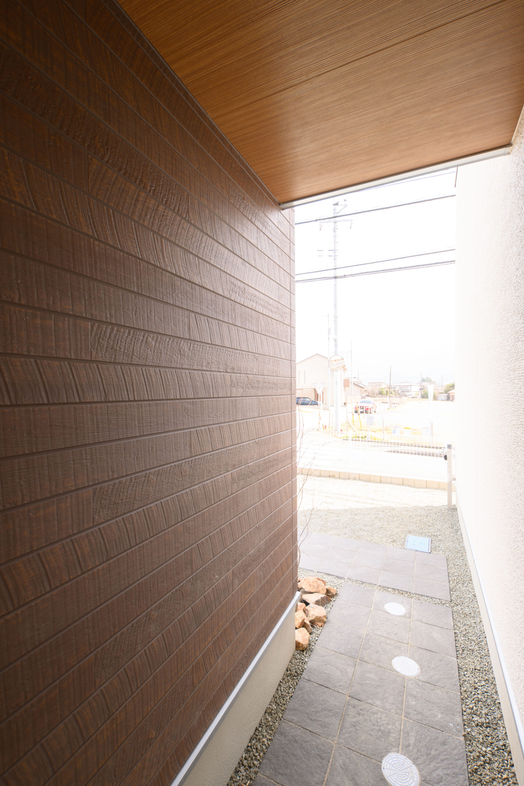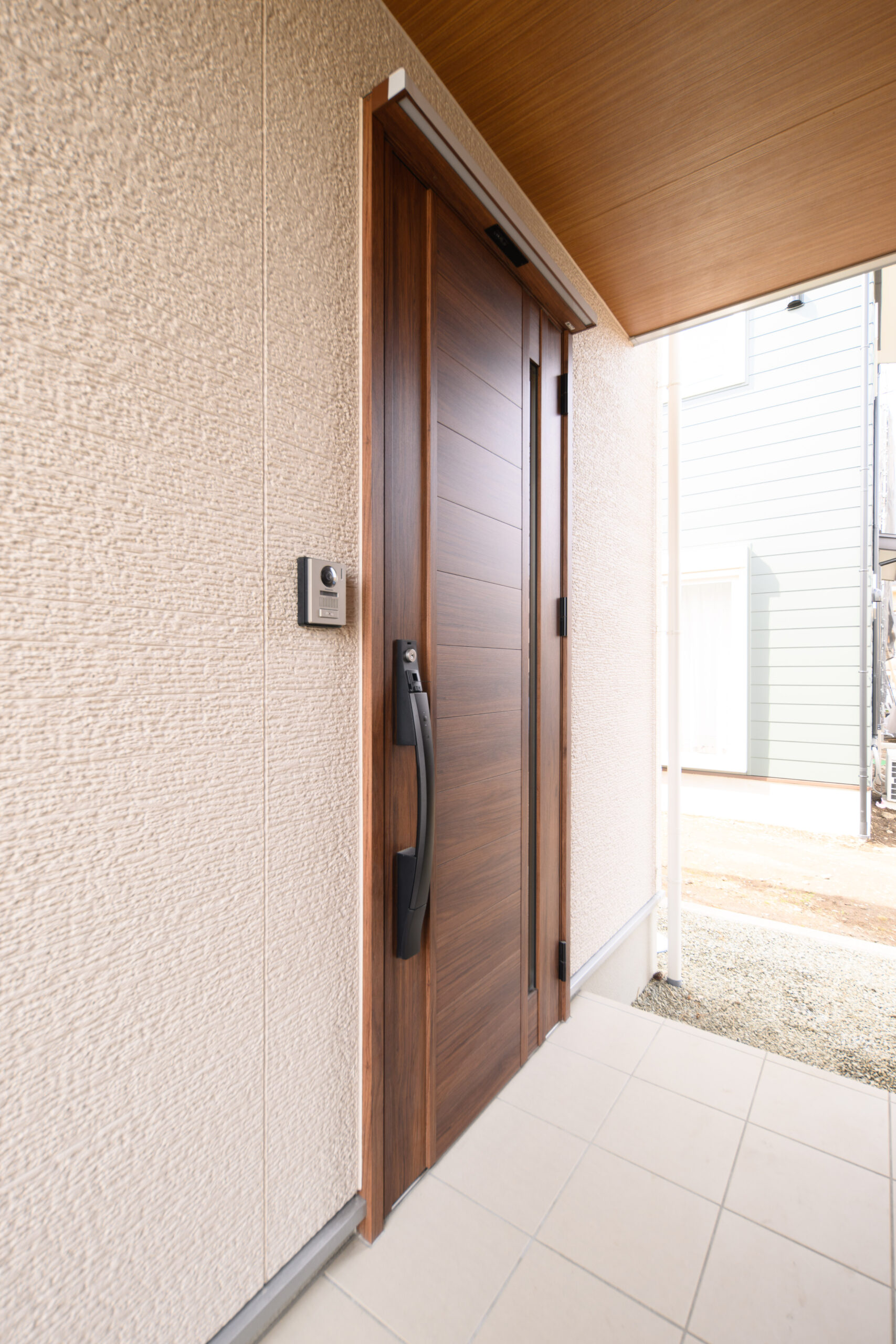 玄関は目隠し壁と屋根付きで、雨の日の出入りや荷物の出し入れも快適。