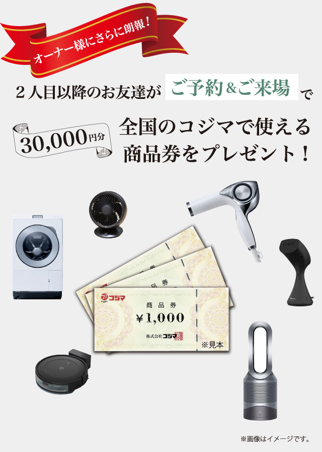 ご紹介いただいたお客様がご成約された場合、30万円相当のオプション費用をプレゼントいたします。オーナー様には、ご紹介いただいたお客様の請負契約時にAmazonギフトカード10万円分をプレゼントいたします。